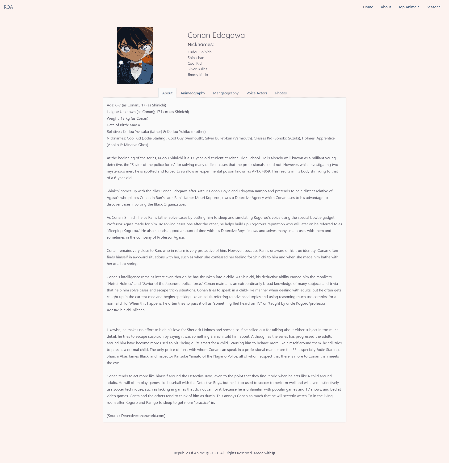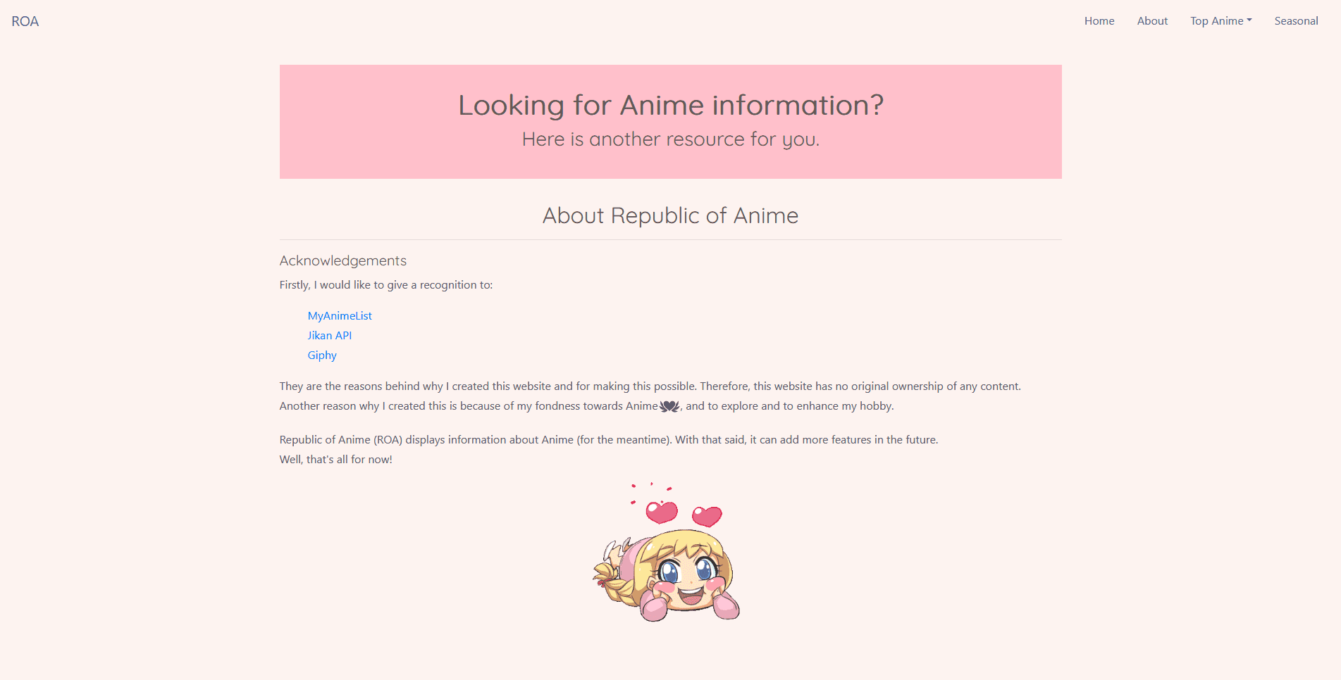 Republic of Anime (ROA) displays information about Anime and it's characters (for the meantime). There are so much more to add, modify, or update for this project. With that said, it can add more features in the future!