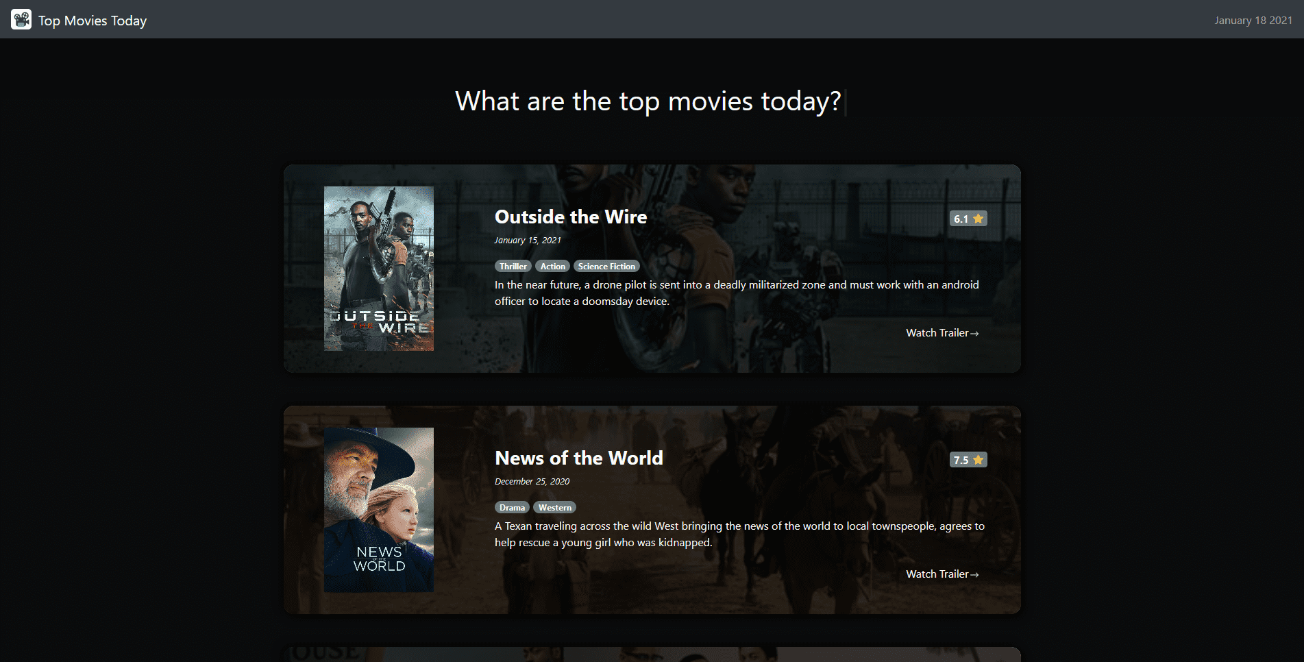 Top Movies Today (TMT) is a movie app I designed and developed to practice more of my frontend skills using ReactJS and Material-UI. It simply displays the top trending movies of today's date. Aside from that, it also displays the movie's basic information like its plot, released date, rating, genre, quote, and even it's trailer video.